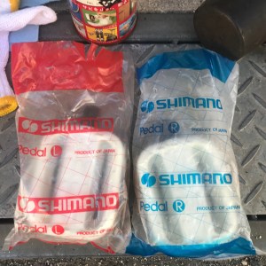 新しいのを買うことにしました。どれを買っても基本的に全て15mmのスパナで脱着できます。でも、ママチャリにロードサイクルのを付けても似合わないのでシンプルなのを調達しました。買ったのはシマノ製のペダルです。ブランドにこだわってみました。右用と左用があります。右用が正ネジ、左用が逆ネジになっています。